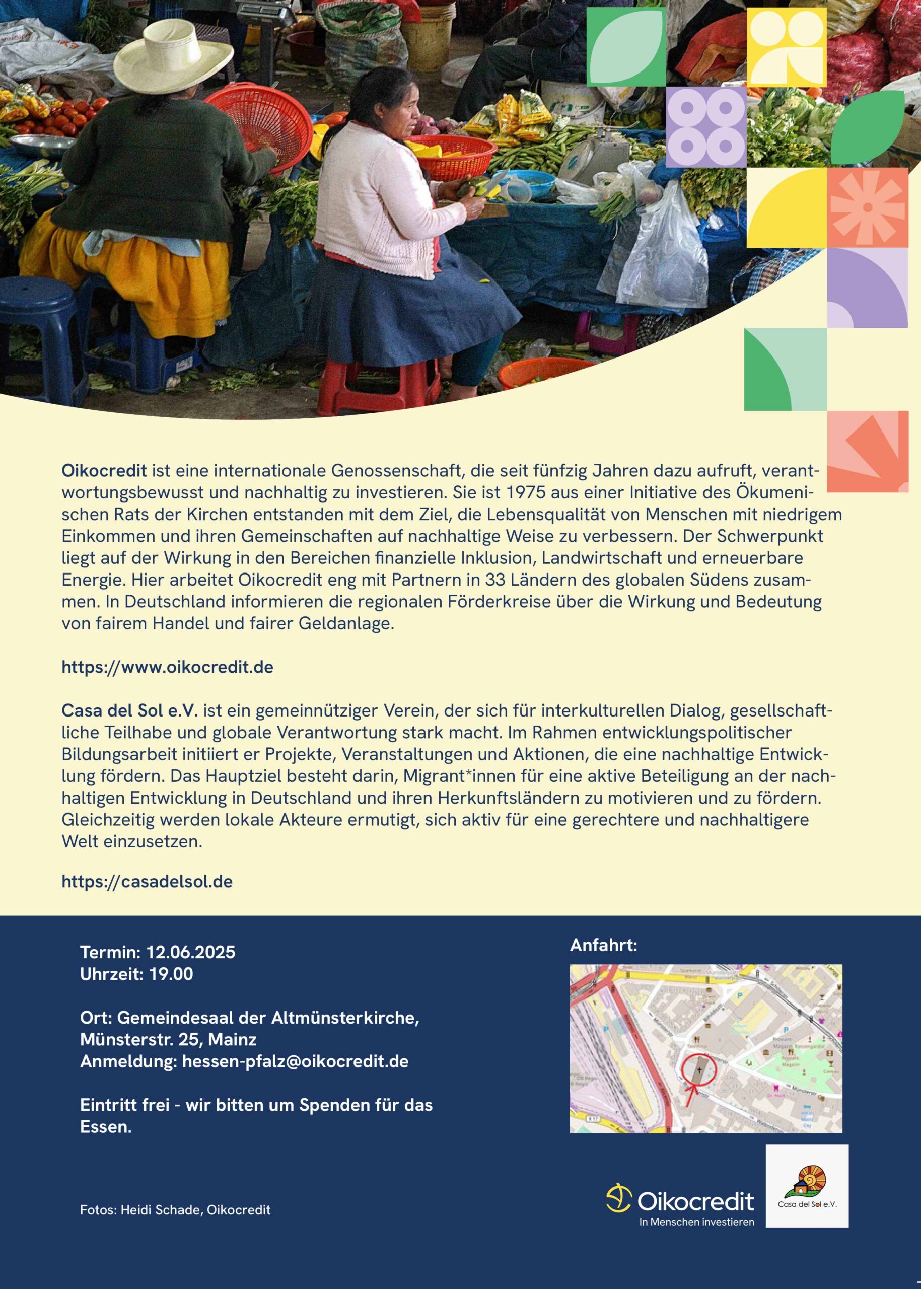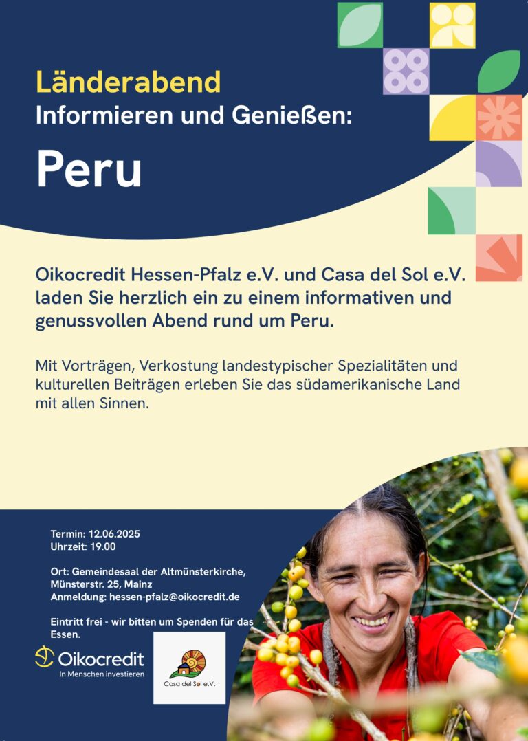 Am Donnerstag, dem 12. Juni 2025, lädt Oikocredit in Kooperation mit Casa del Sol e. V. zum Peru-Abend ein. Bei dieser besonderen Veranstaltung haben Sie die Gelegenheit, das Oikocredit-Partnerland Peru in all seinen Facetten kennenzulernen.